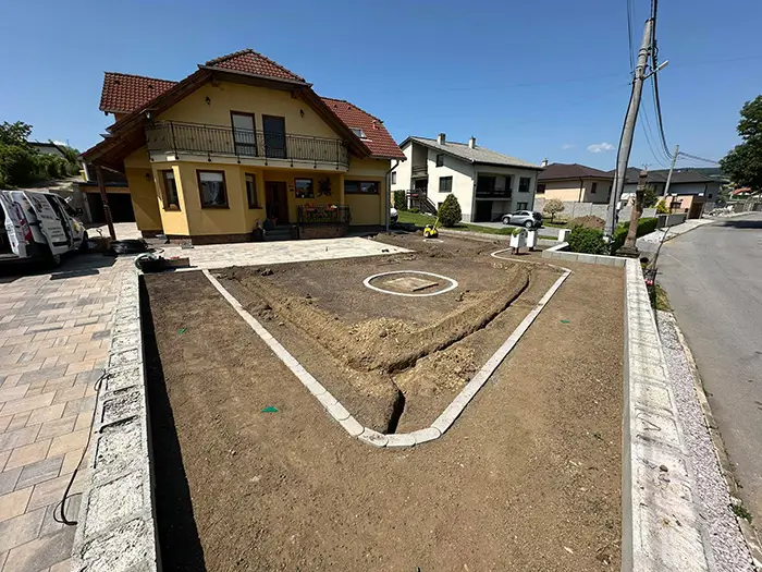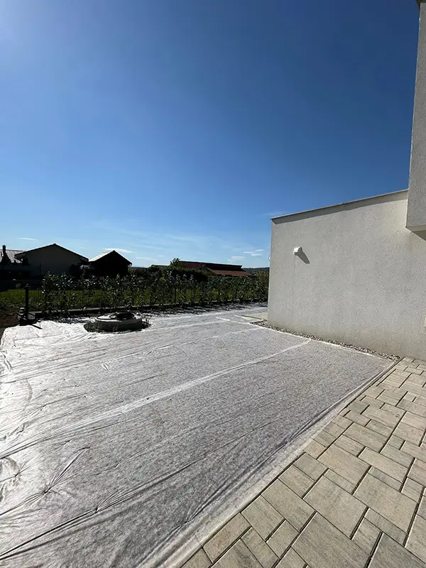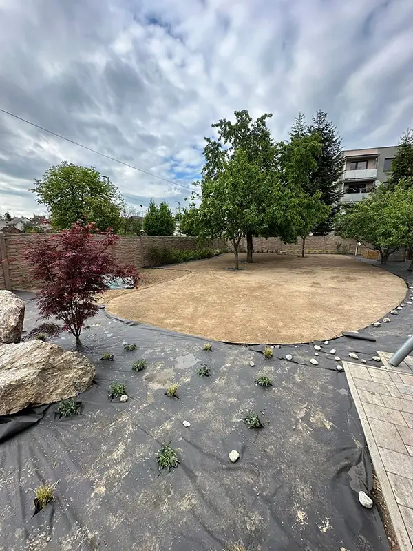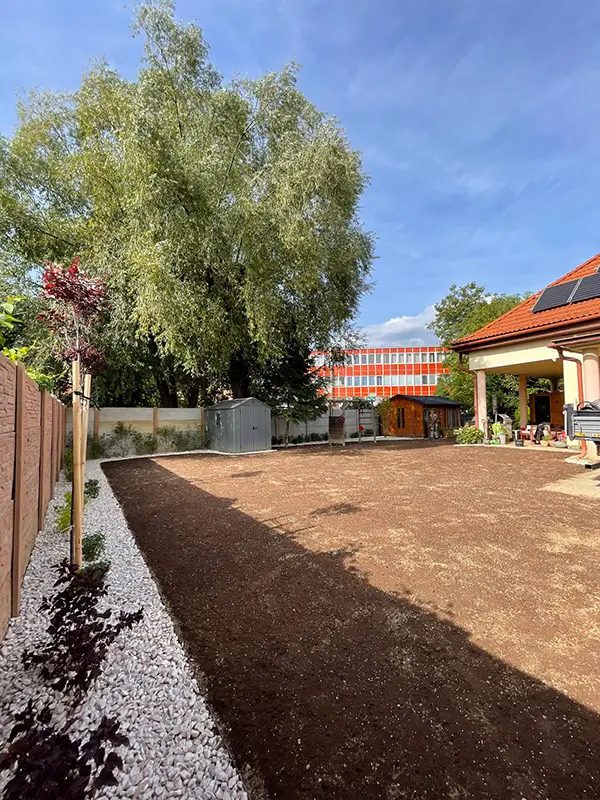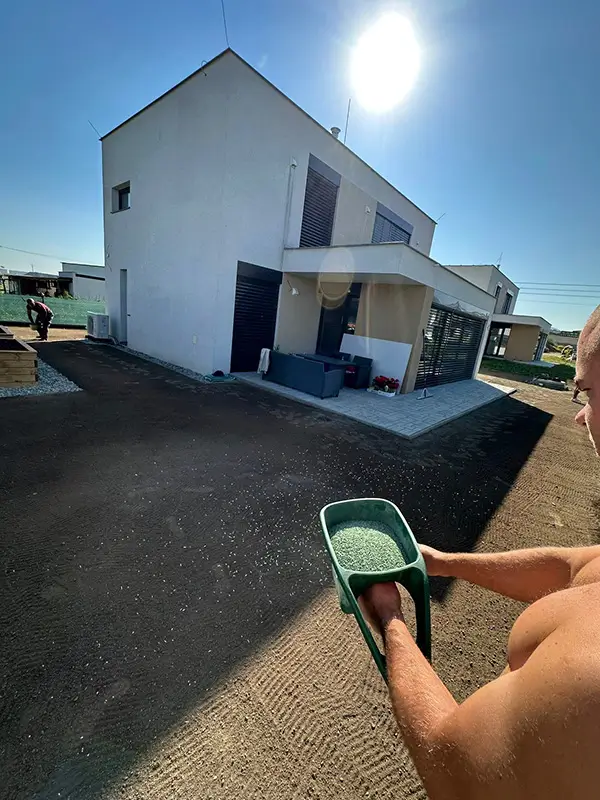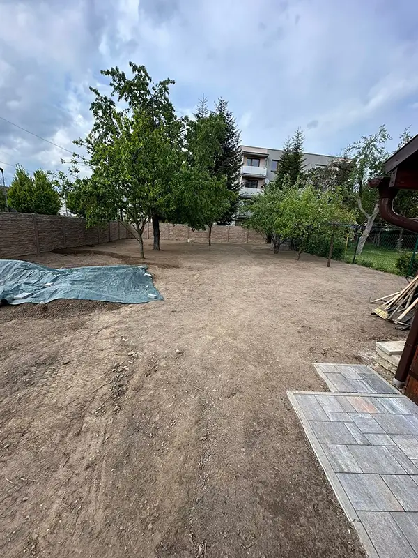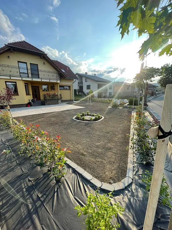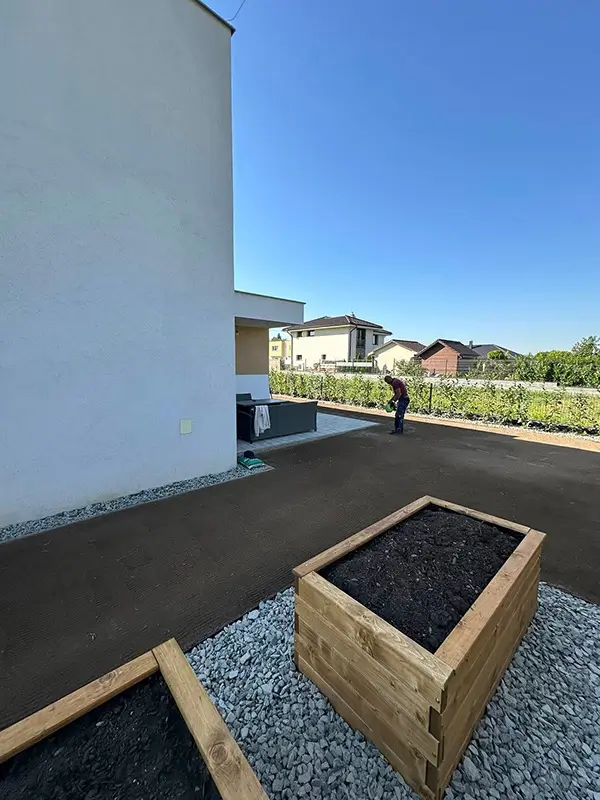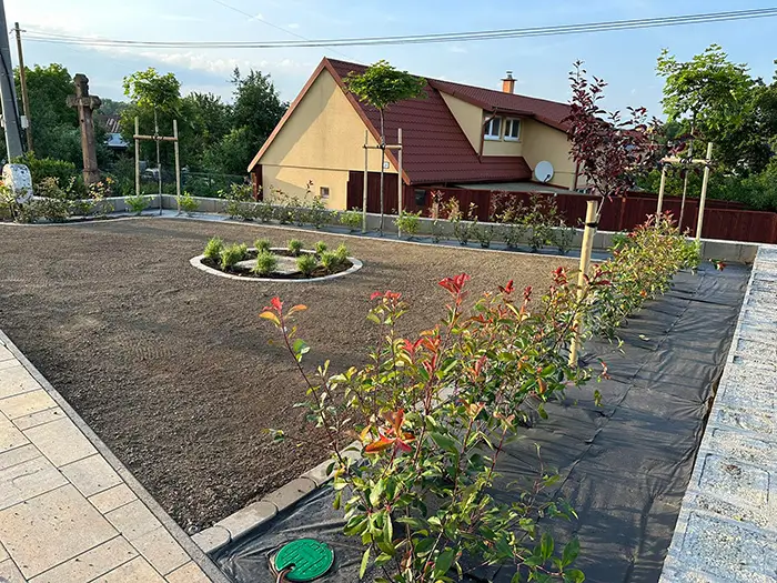 Úprava terénu, záhony a výsev trávnika so špeciálnou textíliou.