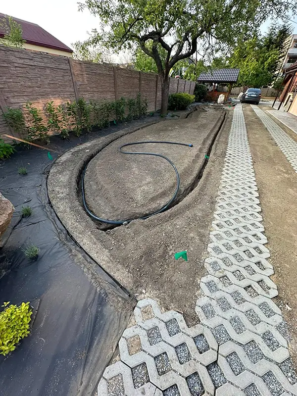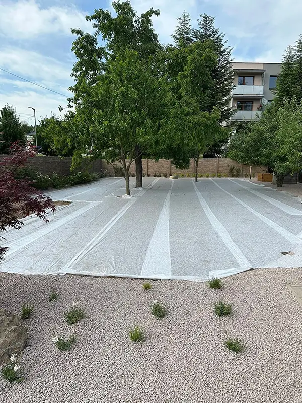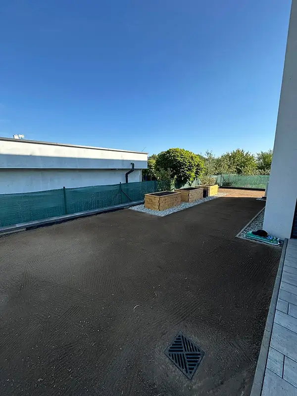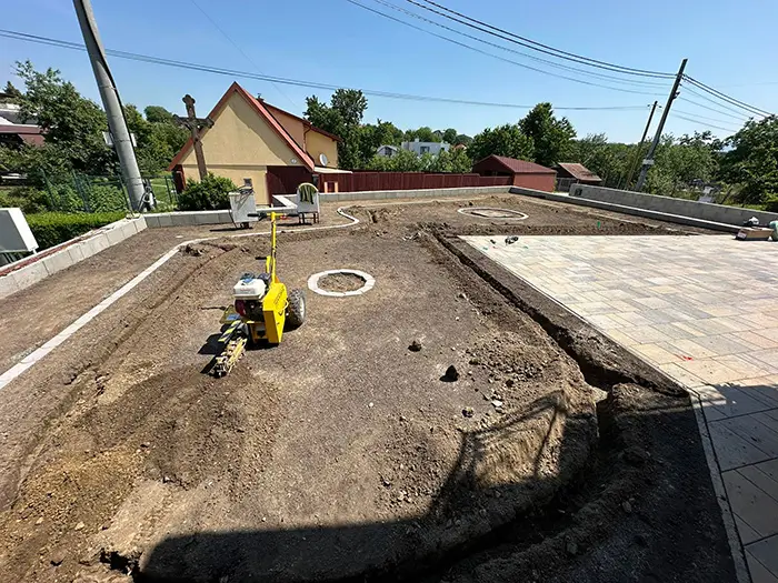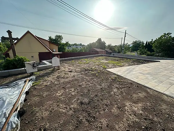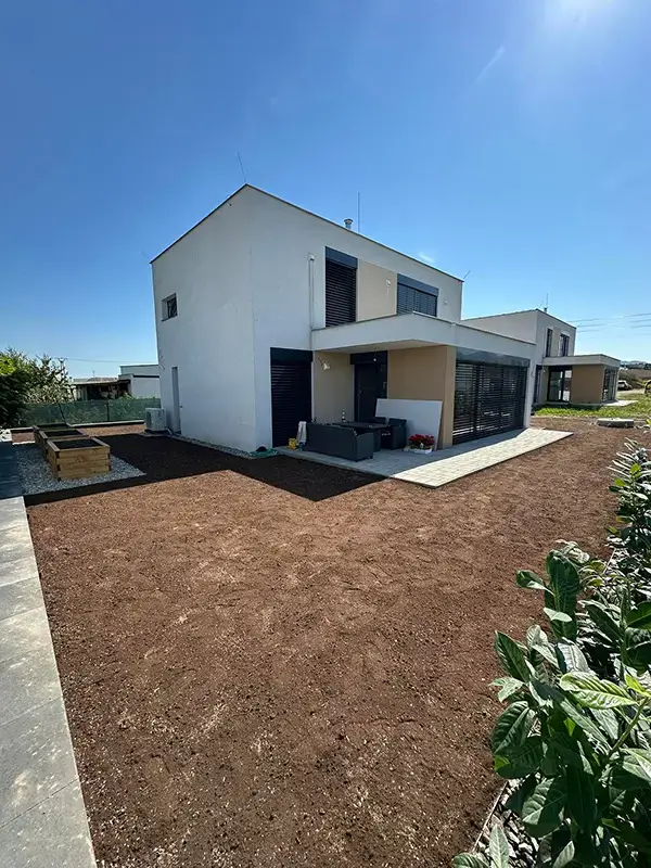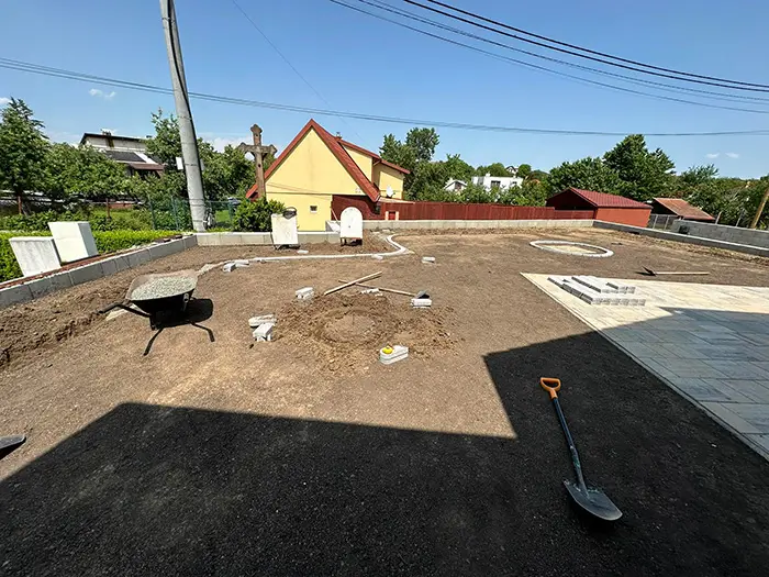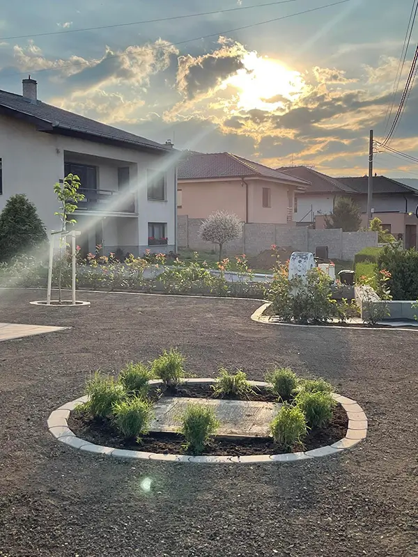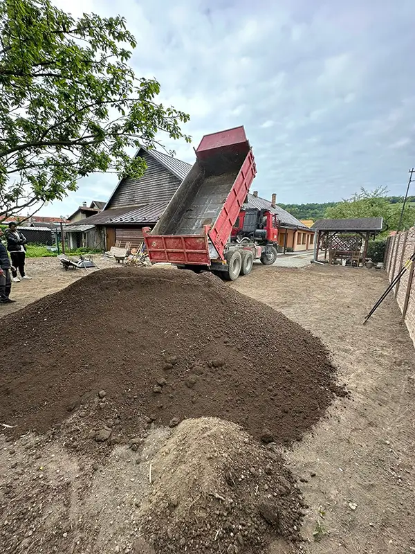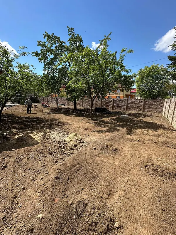 Úprava terénu, záhony a výsev trávnika so špeciálnou textíliou.