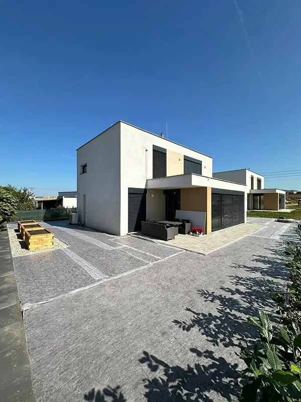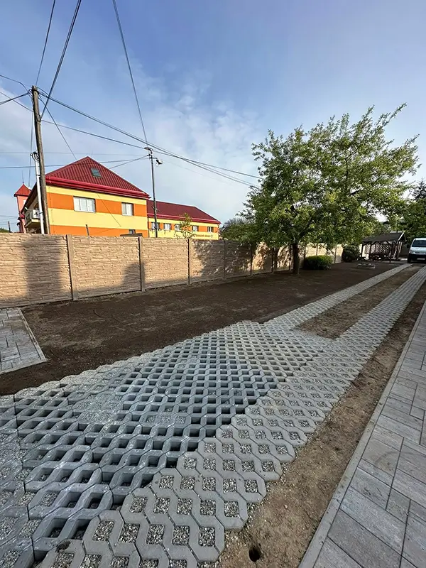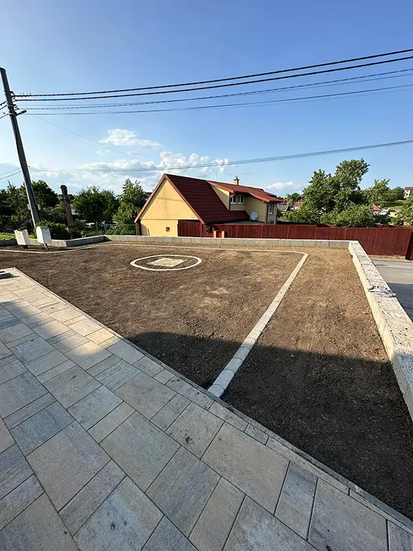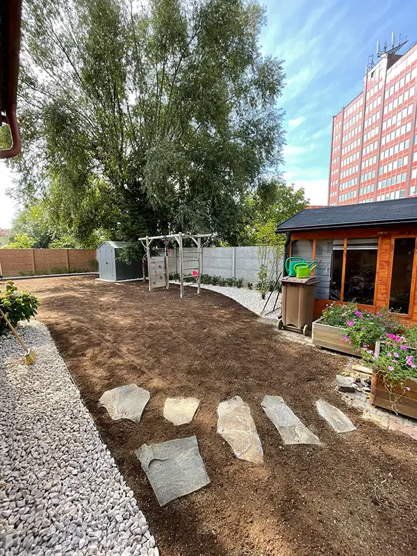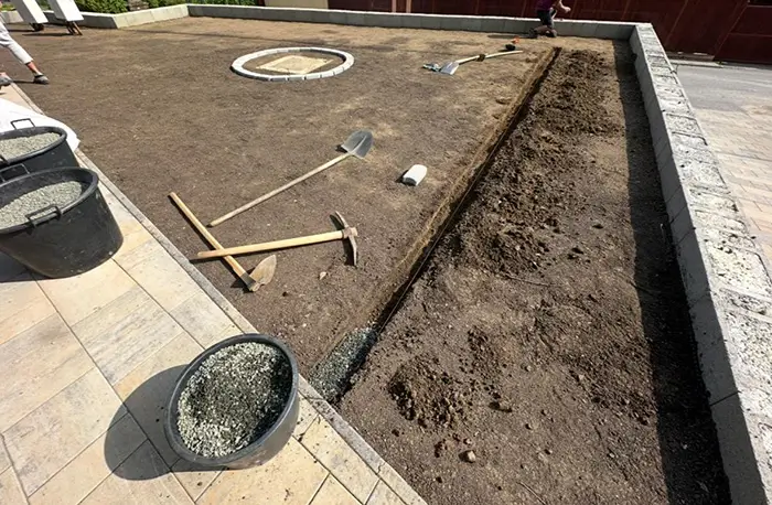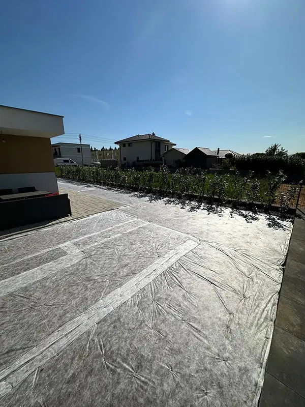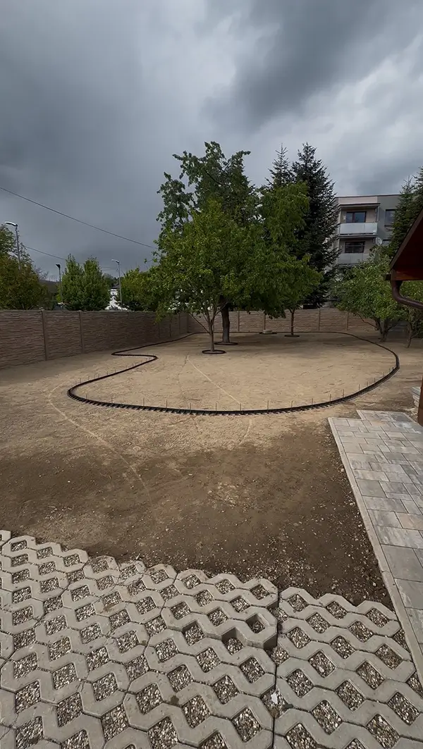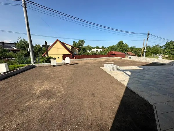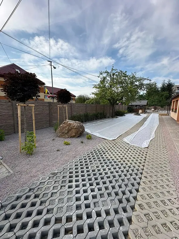 Úprava terénu, záhony a výsev trávnika so špeciálnou textíliou.